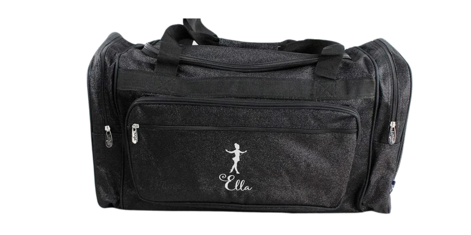 Presenting an exquisite embroidered duffel bag, showcased in glitter with a dancer design and personalized name embroidery on the front. Customize with your choice of name or monogram; a preview will be provided to ensure your satisfaction before stitching.
