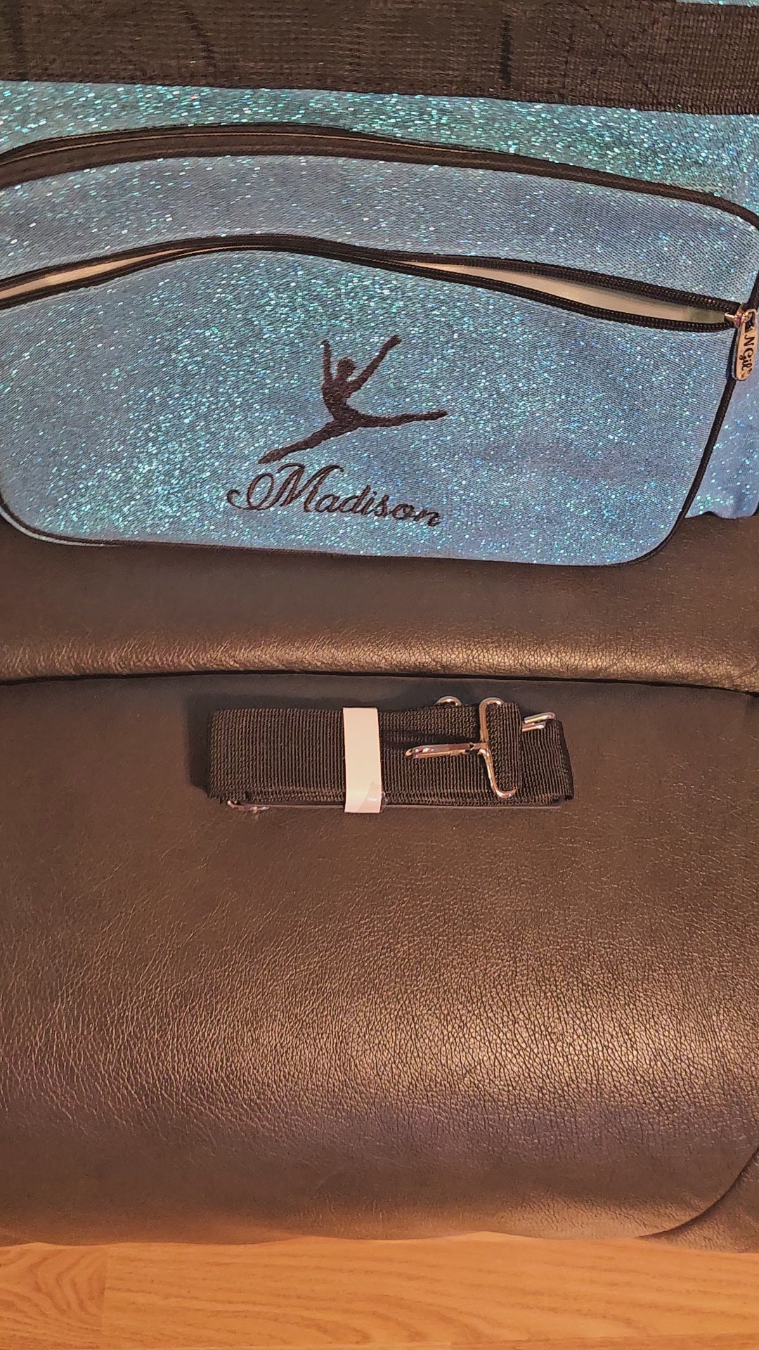 Presenting an exquisite embroidered duffel bag, showcased in glitter fabric with a dancer design and personalized name embroidery on the front. Customize with your choice of name or monogram; a preview will be provided to ensure your satisfaction before stitching.