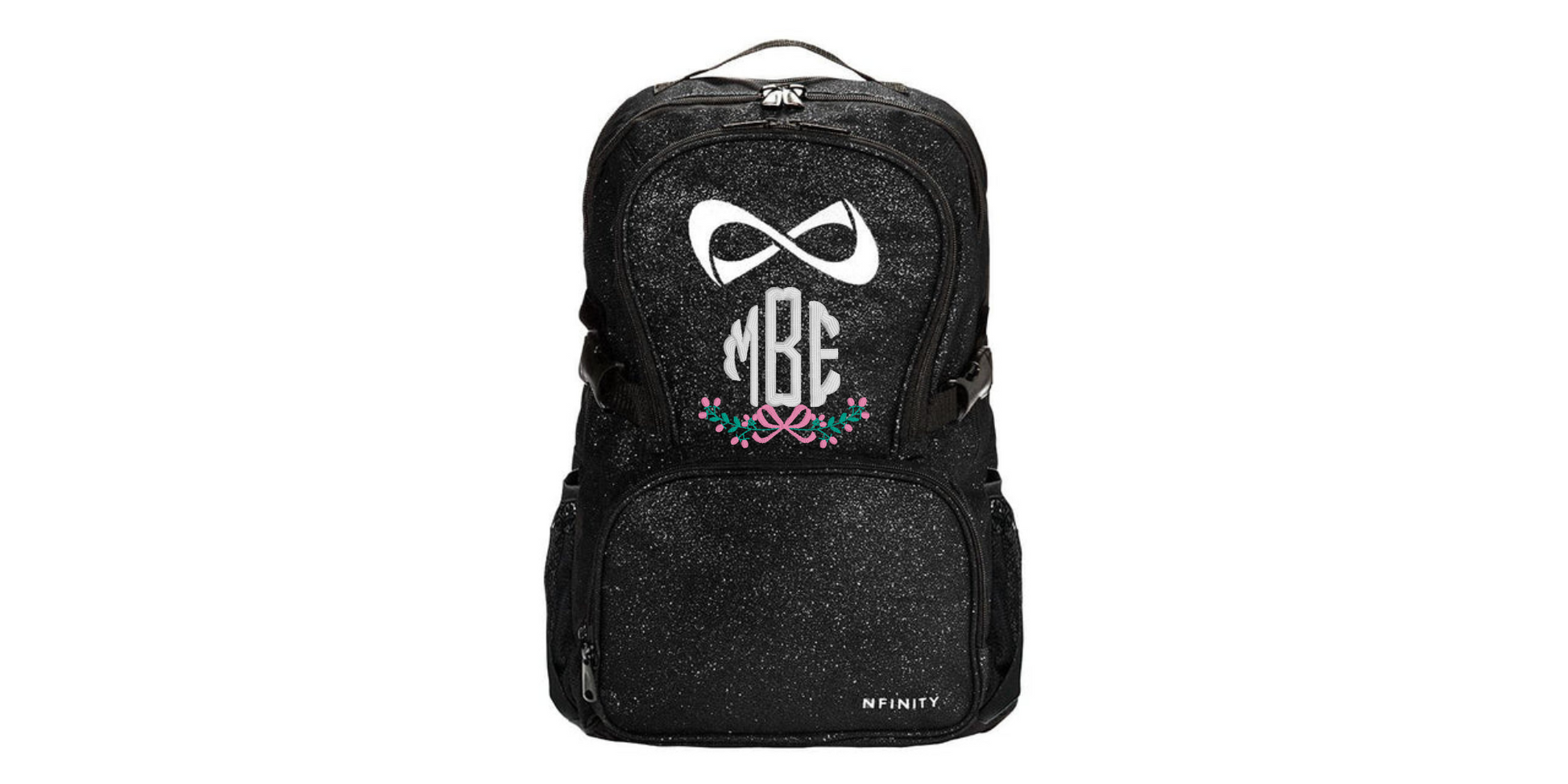 Measuring approximately 48cm (19 inches) tall, 33cm (13 inches) wide, and 20cm (8 inches) deep, this backpack comfortably fits a laptop up to 15 inches and has multiple compartments for organization. It features lightweight sparkle material, mesh back padding for comfort, two water bottle pockets, and the embroidered Nfinity logo. Note: For cleaning, wipe with a soft, damp cloth — do not machine wash.