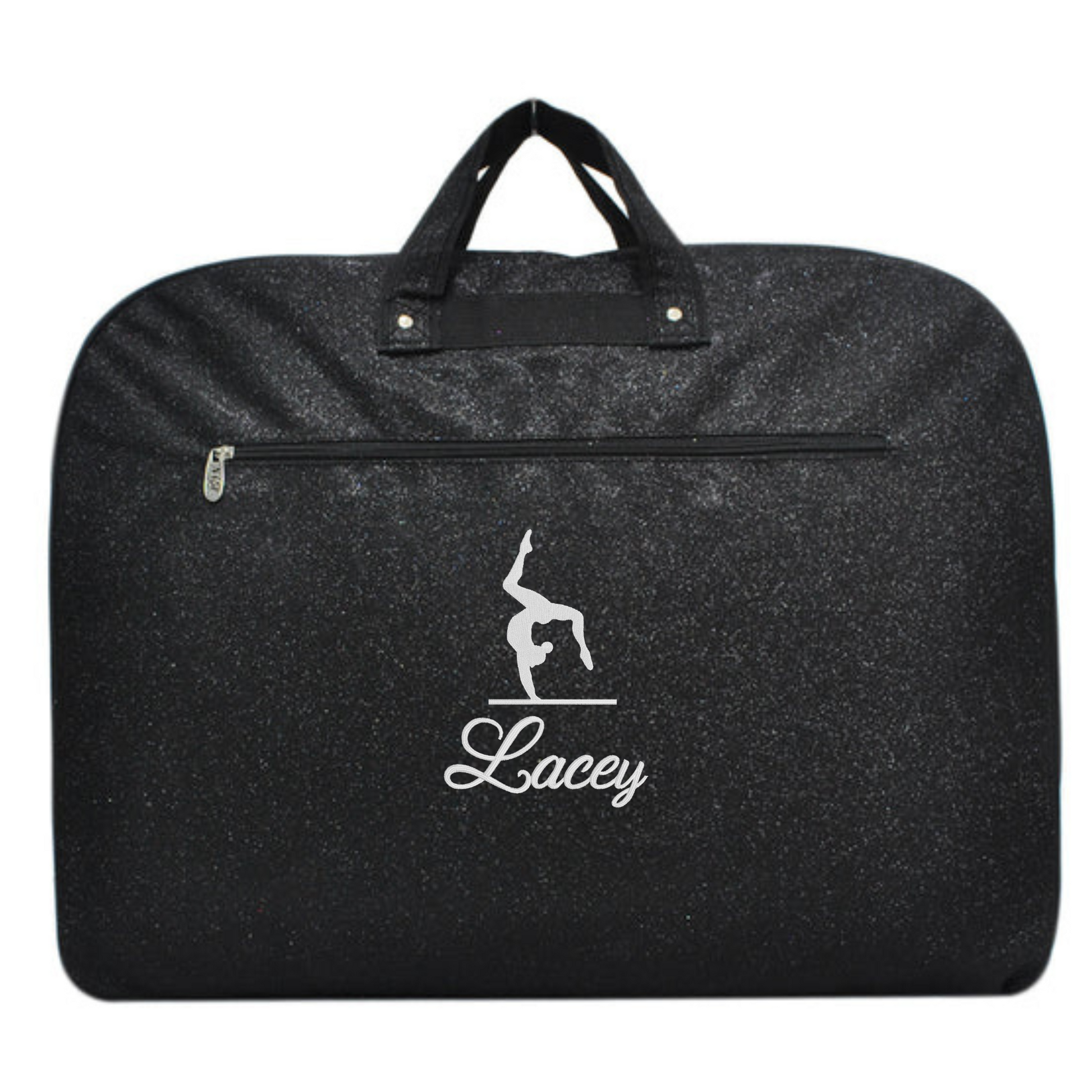 Personalized glitter garment bag with embroidered handstand and name, spacious, durable, perfect for travel, practice, and shows.